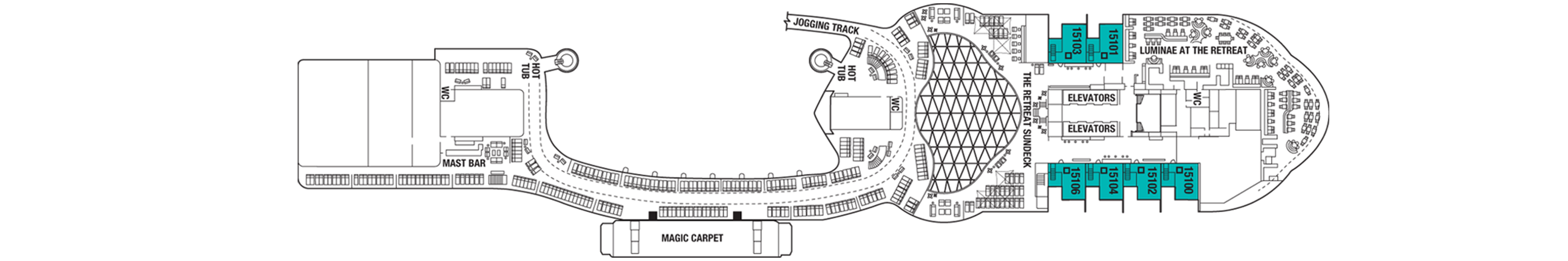 The Iconic Suite is our most luxurious and spacious suite in the fleet. Positioned high on top of the ship, above the bridge, the Iconic Suites offer sweeping, panoramic views from front to back. They’re also the largest suites in the fleet: Each Iconic Suite is an opulent 1,892 square feet. This doesn’t include the expansive outdoor space—where you’ll find a private hot tub, stylish furnishings, and a covered, double daybed—which adds more than 689 square feet to the grand total. Iconic Suites boast two bedrooms (each with a king-sized CashmereTM Collection bed) and two full bathrooms, featuring a full shower, whirlpool tub, and nothing but the best amenities. Enough space for six guests to comfortably unwind in, there’s even an in-suite butler pantry for those occasions when you feel like entertaining. If you want the ultimate in luxury and indulgence at sea, there’s no other way to go than Iconic.
