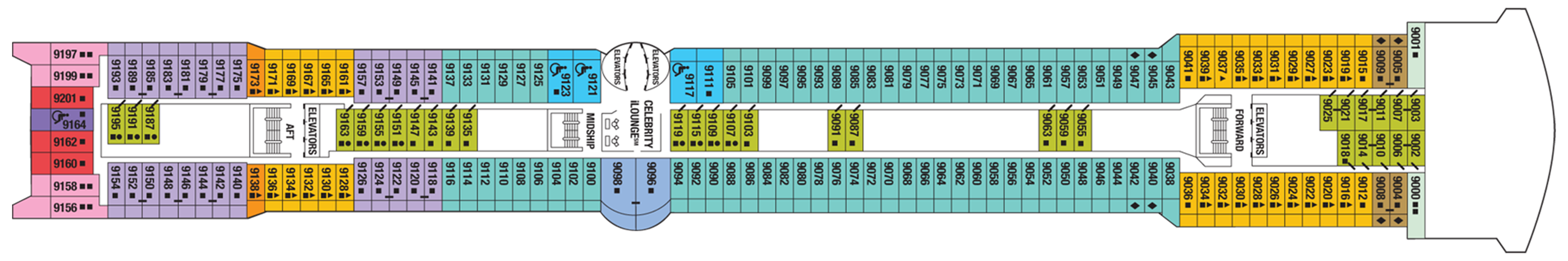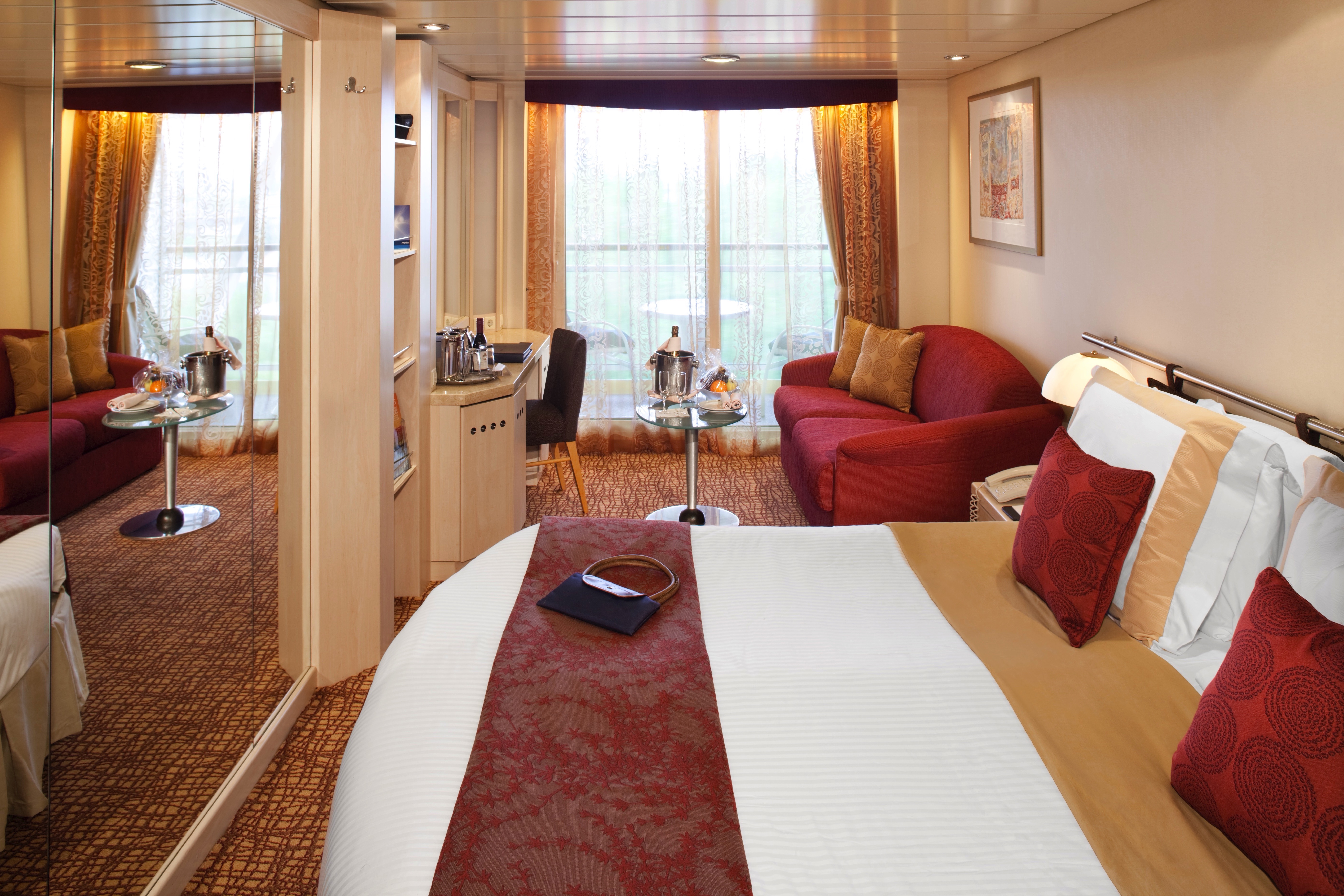 Sleeps 2-4. Studio, 1 bathroom. 170-347* sqft. *AccessibleLocated on higher decks. Midship, central deck locationsSome have option to connect to adjoining stateroom; Ample living space & sitting areaHigher decks: closer to pool, other outdoor venuesKing sized* Cashmere™ Mattress & eXhale® beddingStorage space in your bathroom and wardrobePlush 100% cotton bathrobes and towelsFour pillows in every stateroomPremium Custom blended bathroom productsFresh ice delivered to stateroom upon requestCelebrity Shopping bagSome staterooms may have a trundle bedInteractive television systemHair dryer*Bed as large or larger than average standard international king-size bed