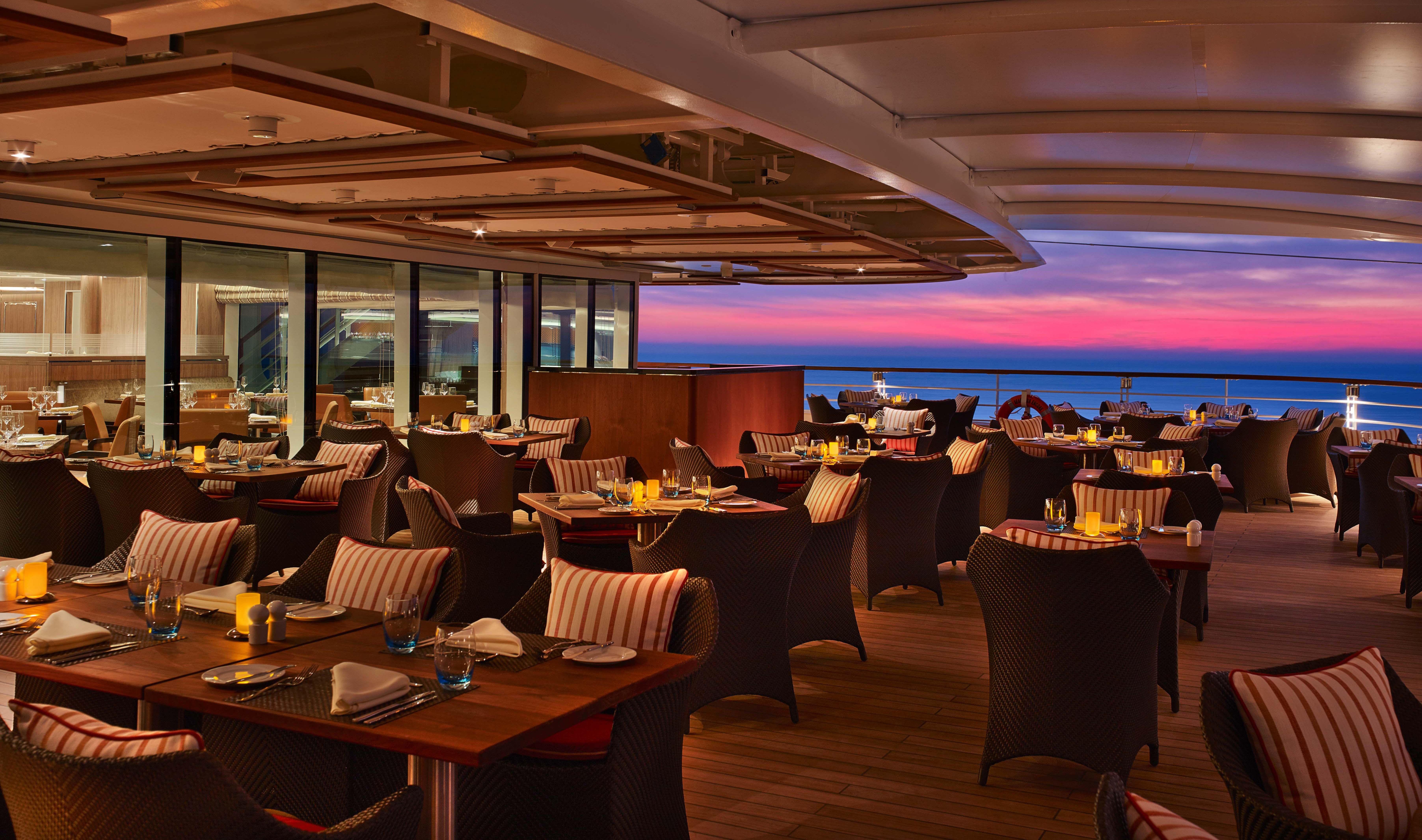 Each evening, our skilled Earth & Ocean chefs create an imaginative array of fresh, inventive dishes—a sophisticated menu celebrating eclectic traditional flavors from around the world, served in a relaxed setting under the stars for a distinctive dining experience unlike any other on board.