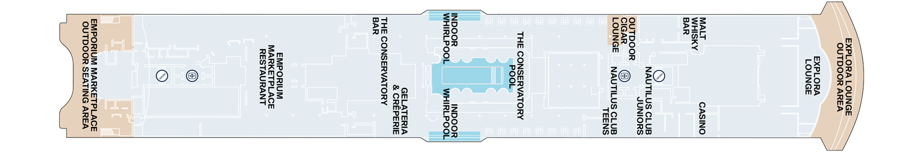 Our adults-only areas onboard are the Whiskey bar within the Observation Lounge (where smoking will be allowed), and the Forward Pool area on deck 12. The use of the Fitness Centre and the Spa Facilities are reserved for guests aged 16 years and older. Following Public Health Authorities requirements, children in diapers, swim diapers, pull-ups, or who are not completely toilet trained are not allowed in the swimming pools and whirlpools.