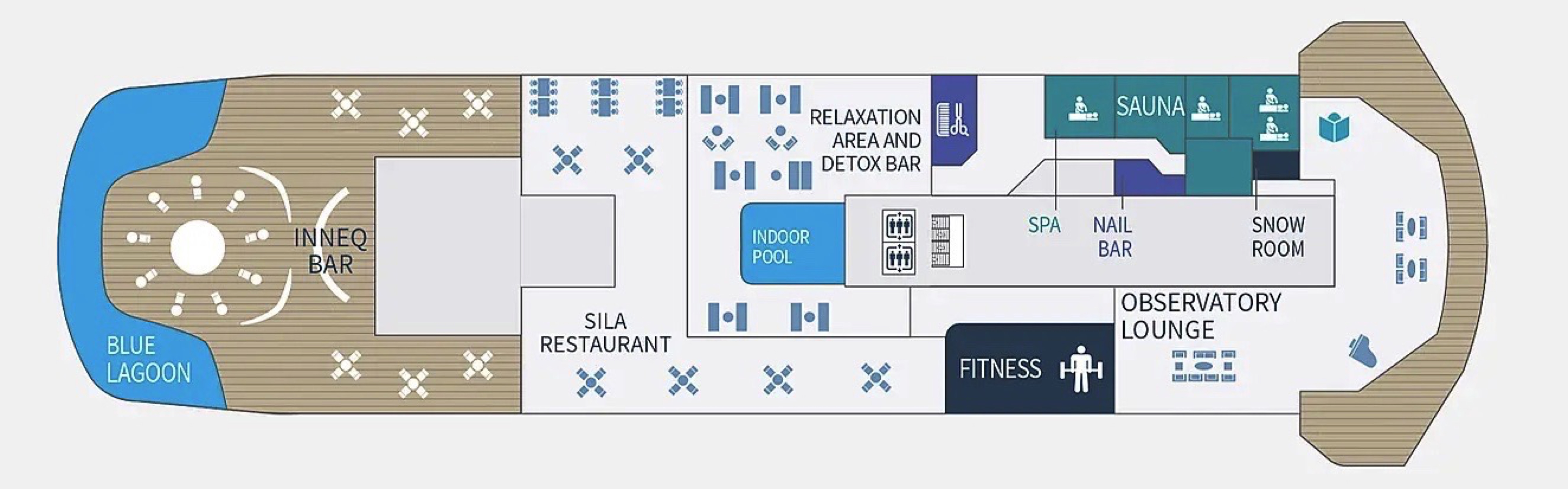Nuna, the 484 m² gastronomic restaurant at the rear of deck 5, can seat all the ship’s passengers at a single sitting. Elegant and refinement are all part and parcel of the à la carte dining experience it has to offer at breakfast, lunch and dinner. The ship’s second bridge is located at the back of the restaurant: behind its large windows, you will have a front row seat to observe the crew during their operations.