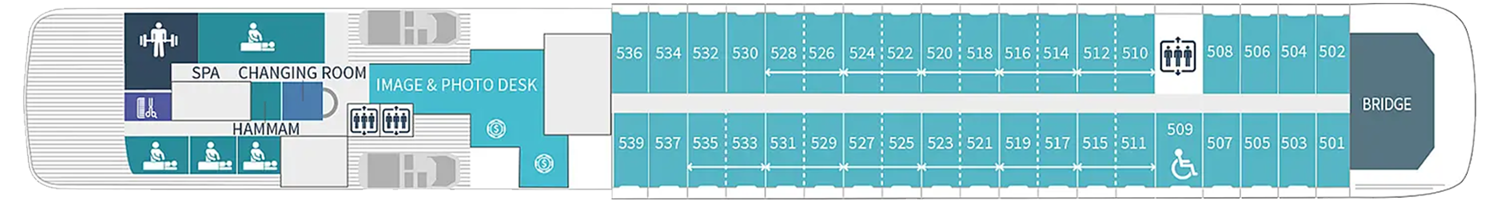 To the rear of deck 2 you’ll find a gastronomic restaurant big enough to seat all passengers together at one sitting.