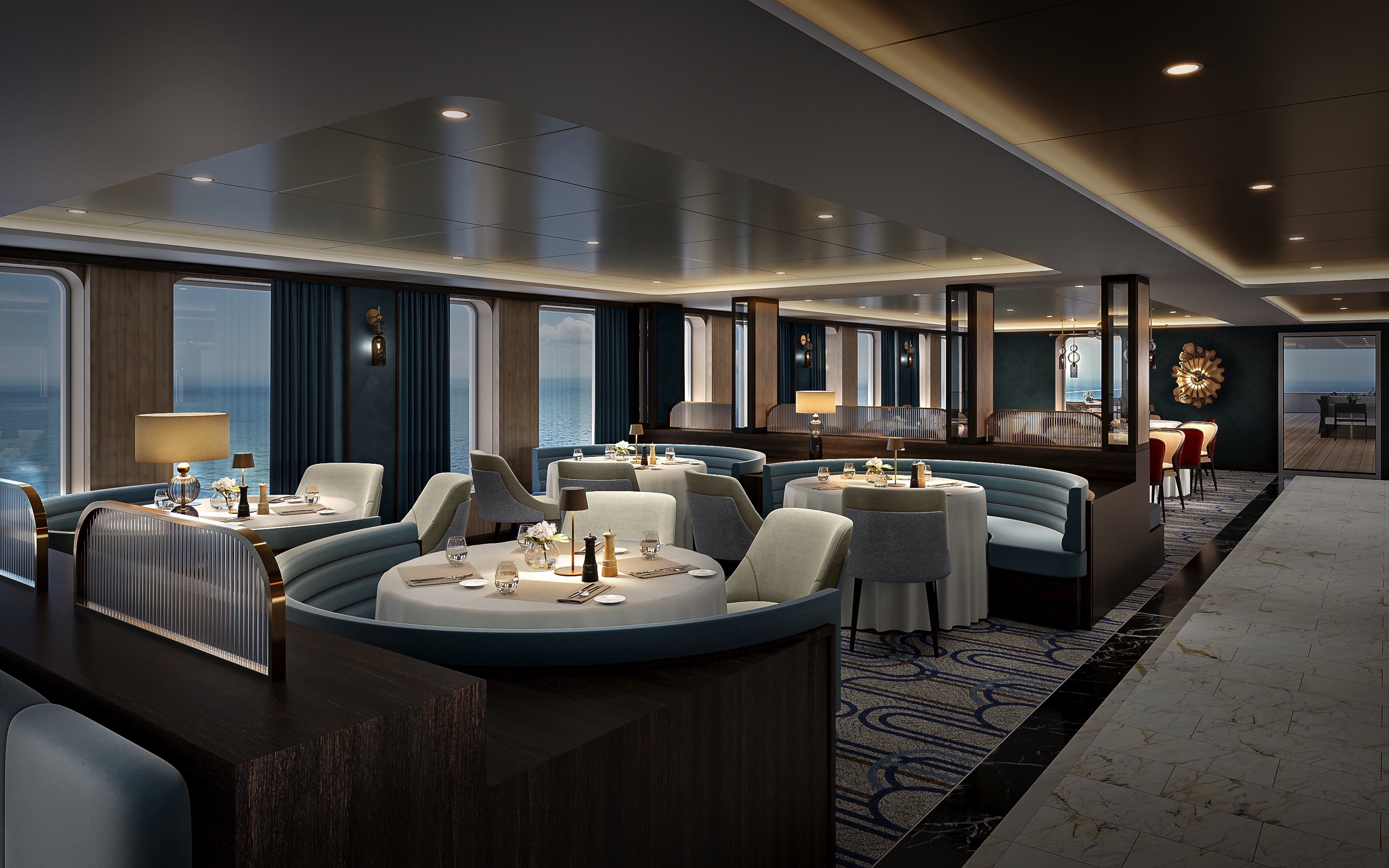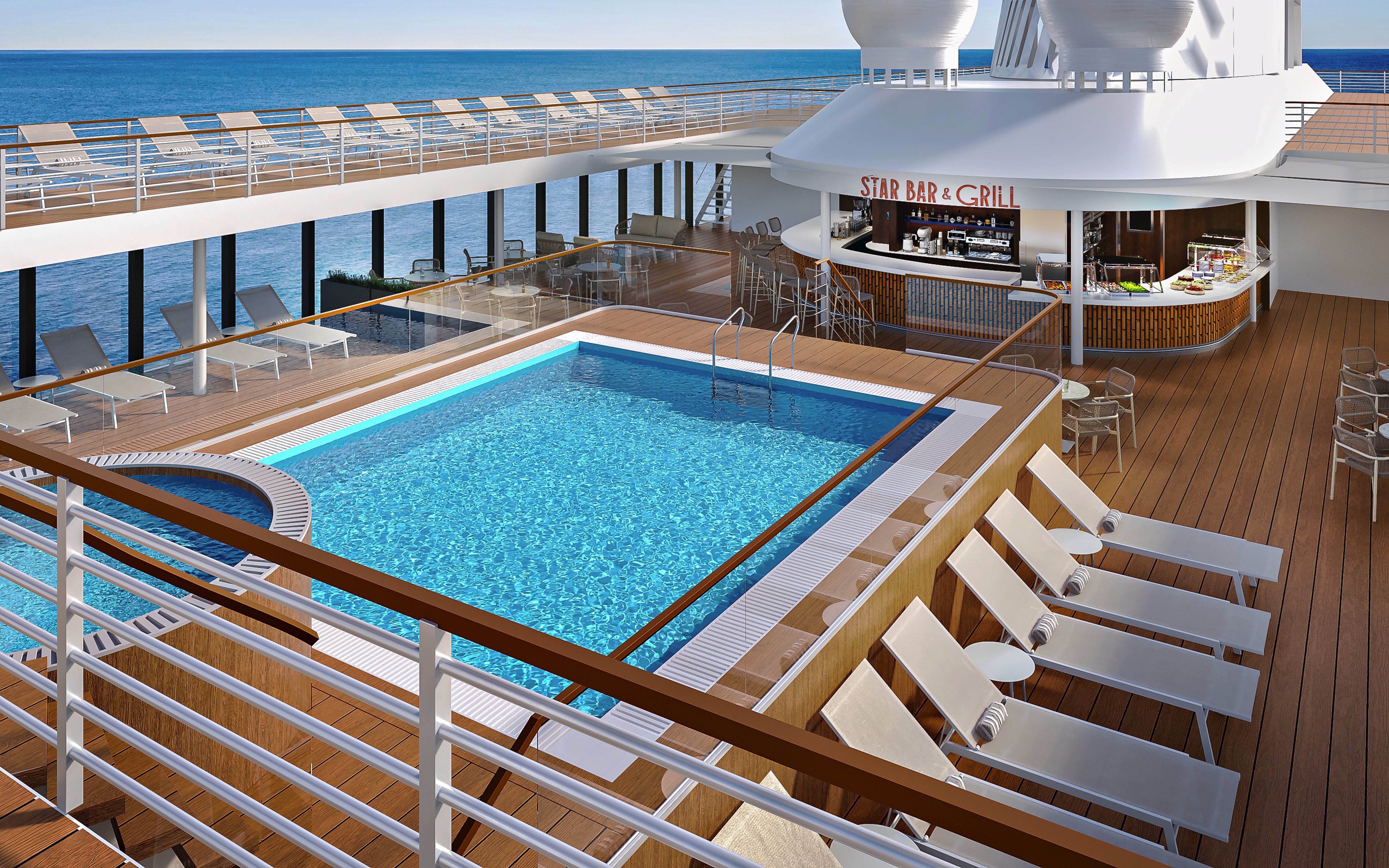 A pleasant lounge and all-day coffee bar, which is the perfect place to relax with new friends and enjoy the 270 degree views from atop the ship.