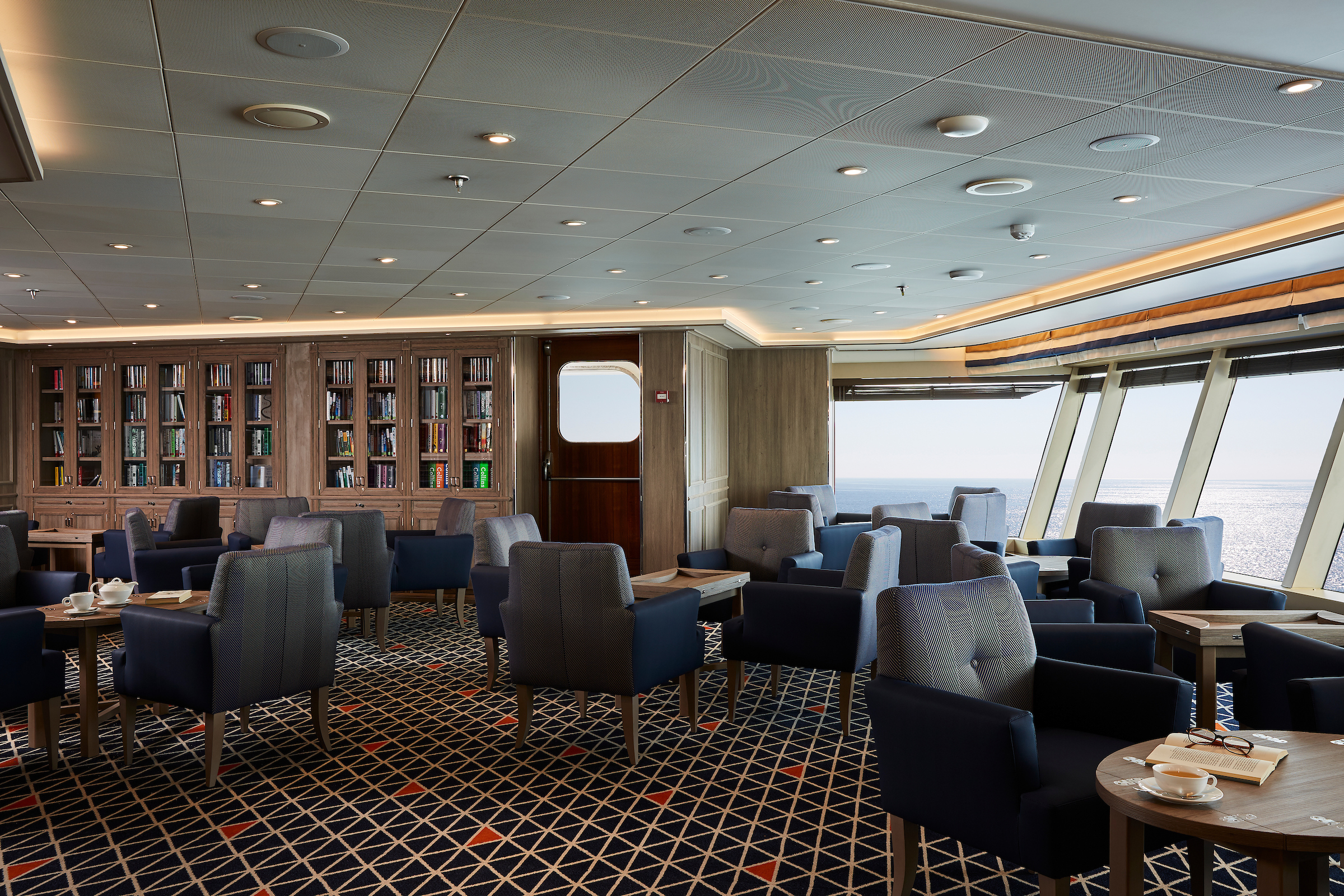 Set on the highest level at the very top of the ship, this is a quiet space for reading and reflection while being dazzled by the undulating seascapes that are essential to life on board. Borrow a book from the in-house library, read the papers, or just embrace the tranquility of being at sea.