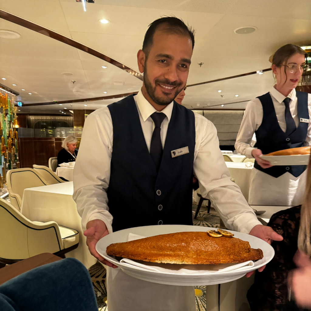 Every evening onboard Seabourn welcomes an ‘elegant casual’ dress code (excluding informal attire), but once or twice per voyage, you’ll be treated to a ‘formal’ evening of black-tie dress. Our such evening consisted of a seven-course Signature Experience in the Main Restaurant, devised by Exécutive Chef de Cuisine Lindsay Lewis and his team. Citrus and dill marinated fresh cured salmon with poached lobster medallion came first, followed by sunchoke cream soup, steamed jumbo white asparagus and a champagne-topped passionfruit sorbet, before we were presented with our choice of pan-seared dorade, pink-roasted beef tenderloin or goat cheese and nicoise olive tart. An open-faced fresh strawberry macaron and ice pralines ended the evening in style.