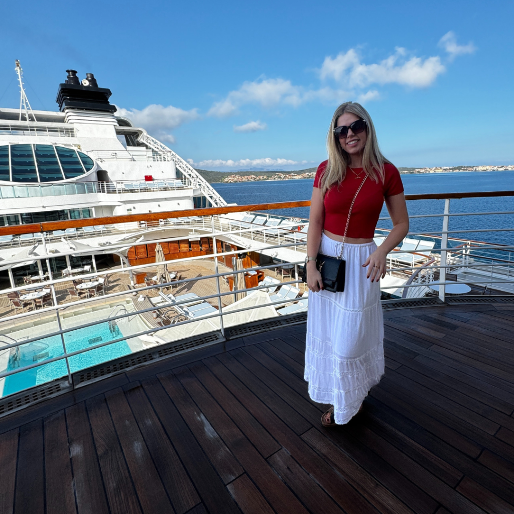 Our Senior Cruise Specialist, Gemma Lovell, and Marketing Manager, Jessica Woods, stepped onboard Seabourn Ovation for a heavenly four-night cruise around the Mediterranean from Rome to Monte Carlo, stopping at Sardinia, Corsica and Portofino along the way. Home to only 600 guests, this luxury ship truly is a five-star hotel on sea – with an onboard spa, five delicious dining venues, a central outdoor pool and several open-air hot tubs – and we are over the moon to be able to share our first-hand experience with you!