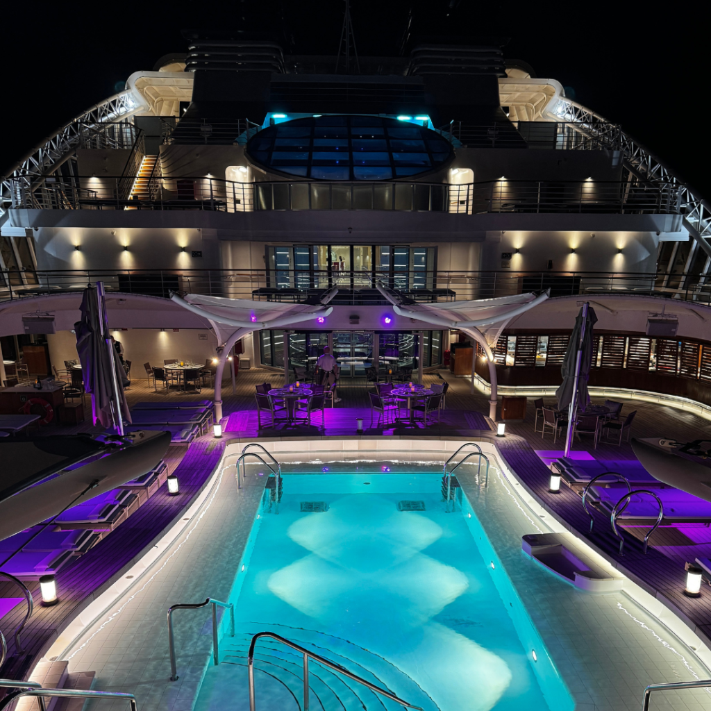 Despite sailing at full capacity, there was never a struggle for a poolside sunbed, a seat in the lounge or a stool at the bar. We dined in every restaurant onboard, enjoying the brand-new speciality Solis restaurant on our first night. We were treated to silky artichoke pappardelle in a creamy herb sauce, freshly prepared salt-crusted dorade with roasted lemon potatoes and white asparagus, and strawberry and mint pavlova, all washed down with paired wines and a bespoke after-dinner cocktail.