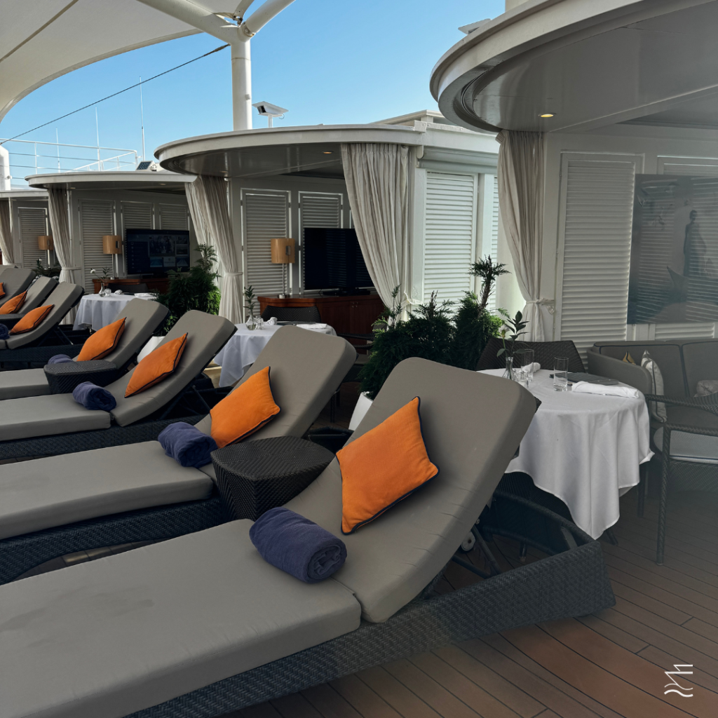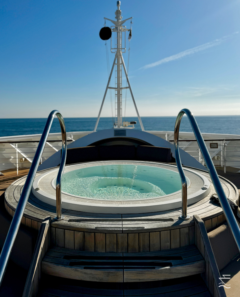 Back on board, we found a hidden gem! Right at the front of the ship on deck 7 is a hot tub, surrounded by loungers, that was completely deserted! It felt undiscovered, although from speaking to other guests, we learned that there are just so many of these hidden spots all over the ship (and never a struggle to find space on the main deck) that most are just left quiet – a sign of a truly luxurious experience which highlights the miniscule number of guests that Seabourn have chosen to enjoy the space on a ship this size.