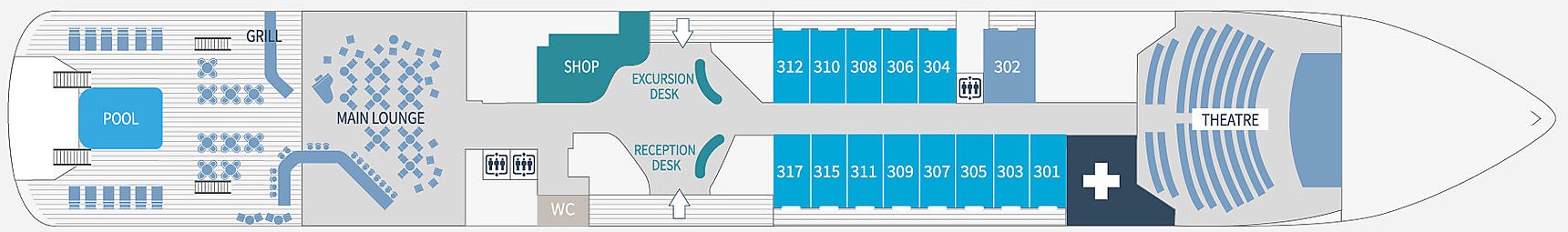 Able to accommodate all our passengers at once for moments of shared conviviality, and as a venue for both daytime and evening shows and entertainment