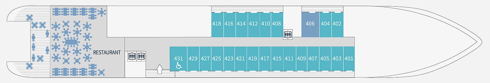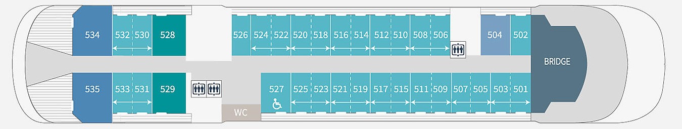 Towards the rear of deck 4 you’ll find a panoramic restaurant large enough to accommodate all our passengers at one sitting. Offering a different concept than on our other ships, this space is open to the exterior and serves buffets of salads, desserts and cheeses. Our discreet and attentive staff provide a table service for hot meals
