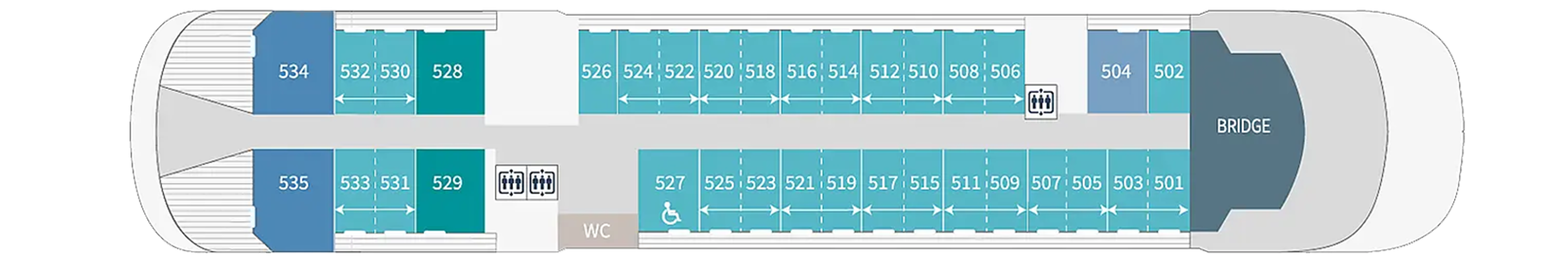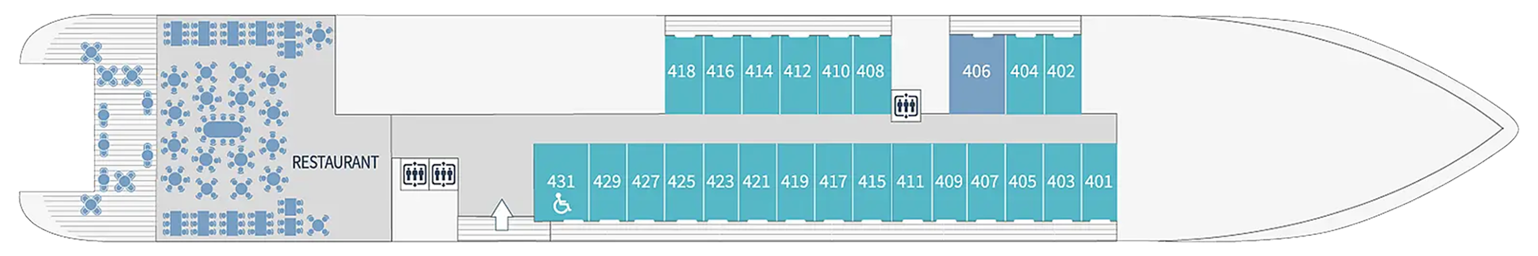 Towards the rear of deck 4 you’ll find a panoramic restaurant large enough to accommodate all our passengers at one sitting. Offering a different concept than on our other ships, this space is open to the exterior and serves buffets of salads, desserts and cheeses. Our discreet and attentive staff provide a table service for hot meals