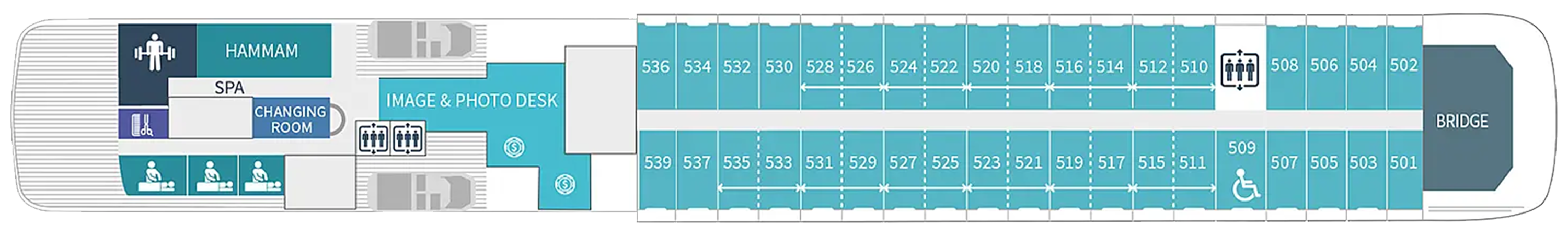 Free Wi-Fi internet access is available on all of our ships, in both the staterooms and the communal areas. One or several computers are at your disposal in the recreation centres. Please note that the Wi-Fi connection may be discontinued depending on the navigation area and landscapes that may block the vessel from satellite coverage, especially at high latitudes (no connection possible beyond 80° North or South), or for technical reasons beyond our control.