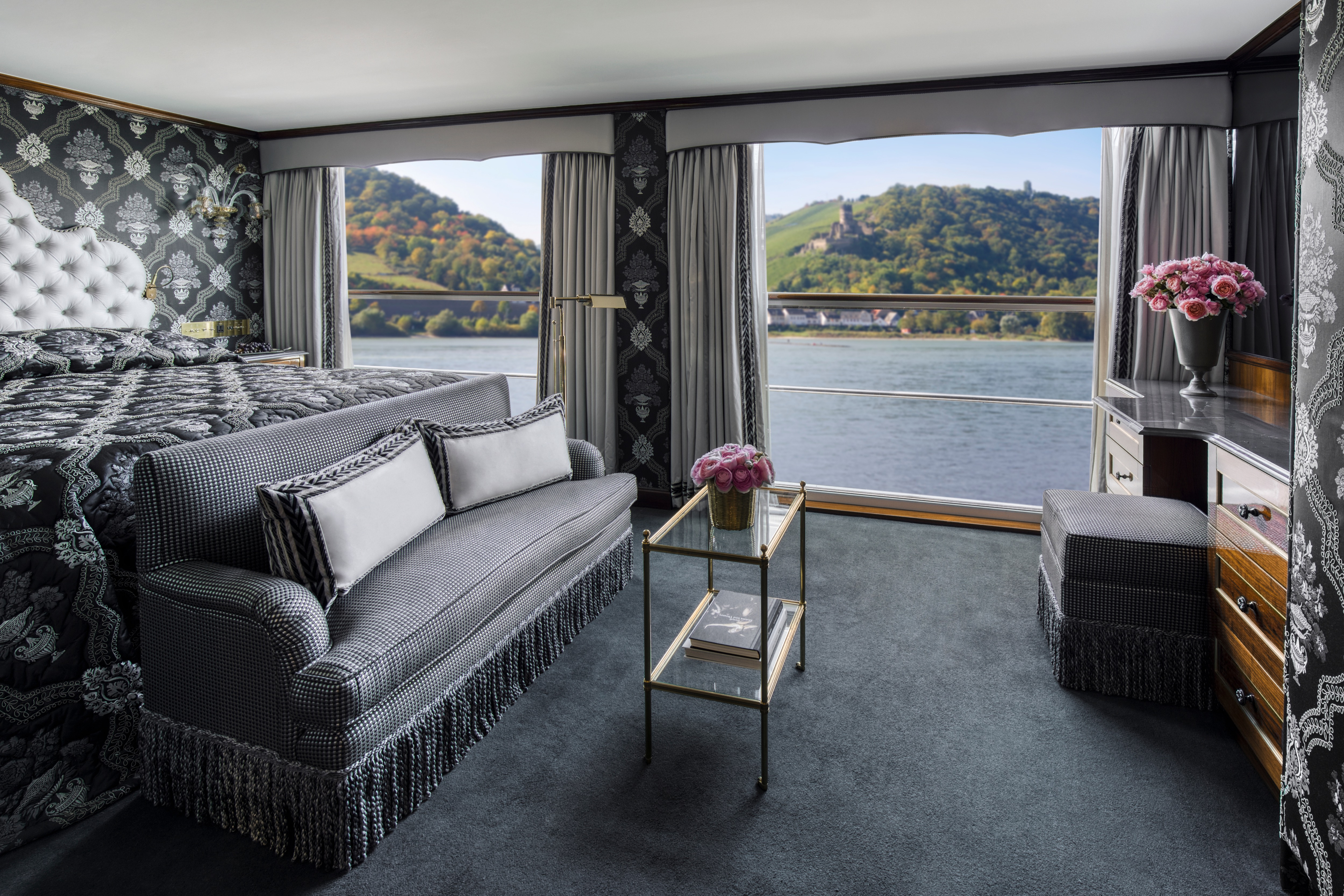 Luxurious riverview stateroom (196 sq ft – 18.2 sq m) with enclosed balcony with floor-to-ceiling windows