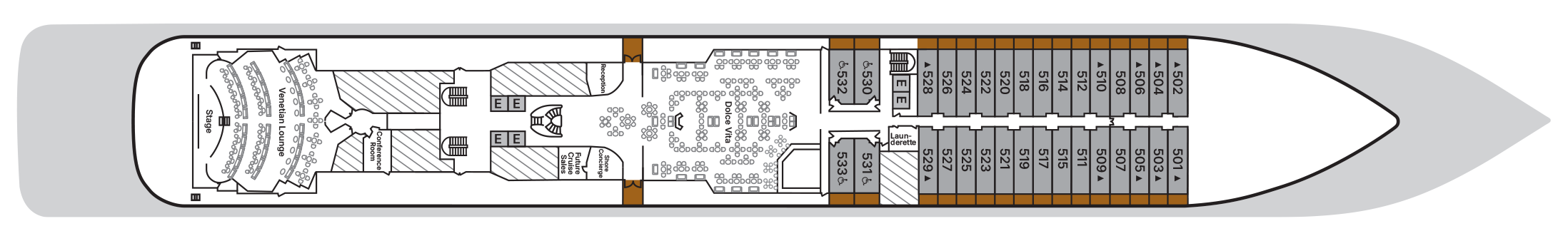 Also, can be found on the deck plan after clicking on the “View Deck Plan” tab on the ship page. The disabled access suites are indicated with the universal accessibility icon.