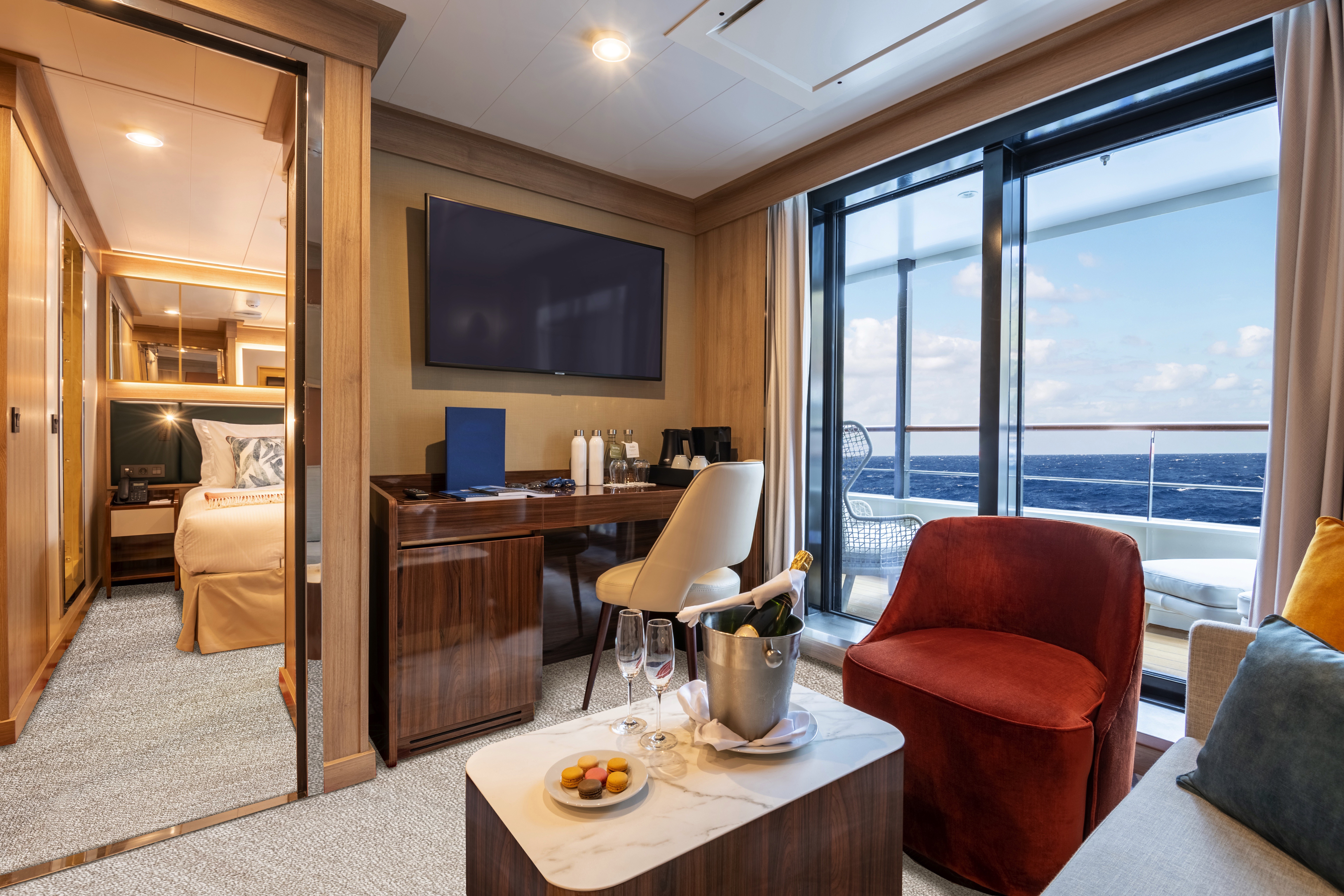 Located on Decks 5 and 6, and approximately 270 sq. ft. (25 sq. m) in size, these cabins have one double or two single beds, and a 100 sq. ft. (9.5 sq. m) walk-out balcony with access from sitting room and bedroom. A separate sitting area with sofa, walk-in closet, refrigerator, TV, state of the art “infotainment” system, and private bathroom with shower is also featured in each cabin.
