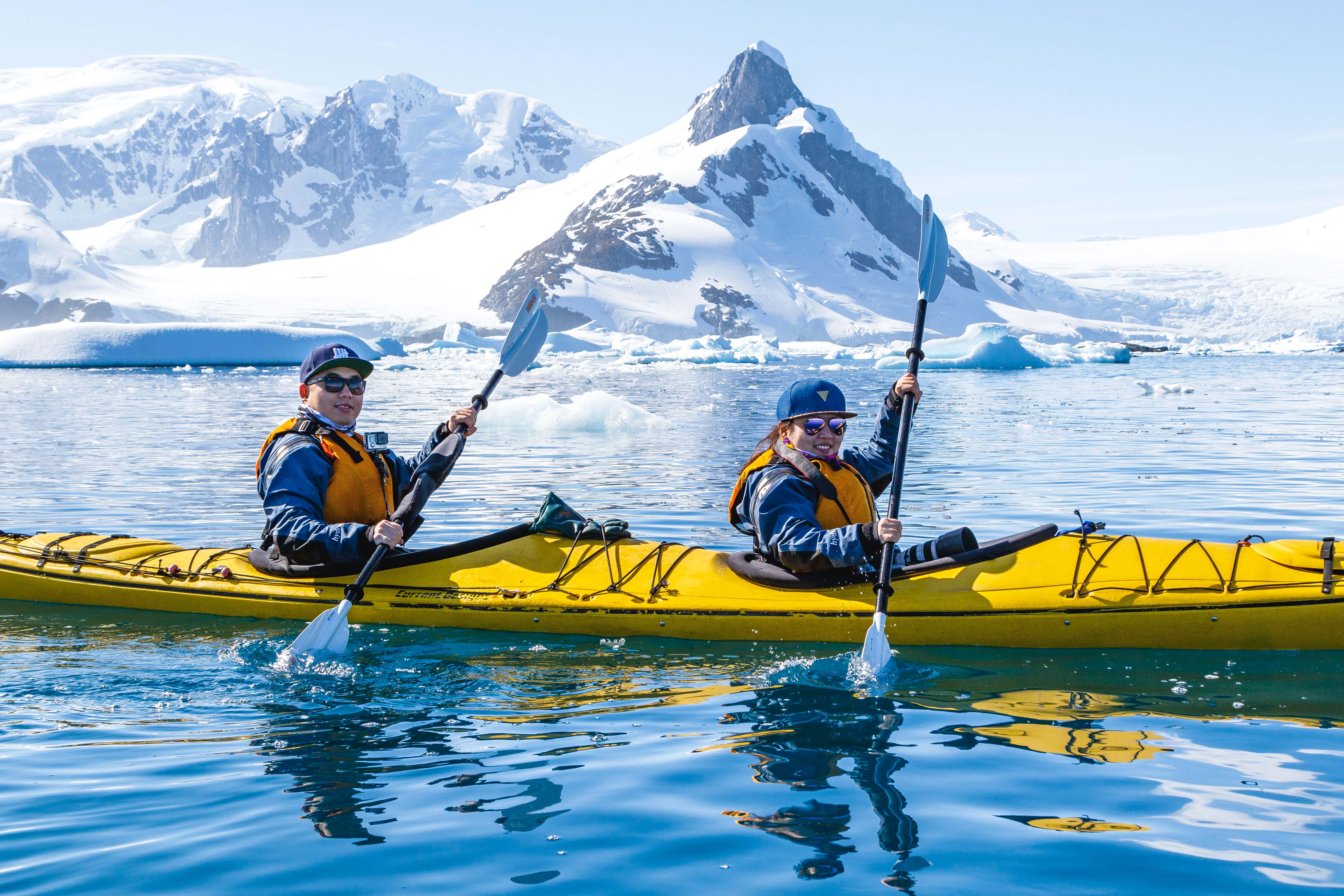 Our Paddle Excursion Program provides sit-on-top, two-person, inflatable kayaks that provide guests with an intimate, water-level experience in unforgettable locations in both the Arctic and Antarctica. These stable, rugged and comfortable crafts are an ideal way to see the polar regions from a different perspective. On-ship, you’ll be provided with instruction and equipment including dry suits, personal flotation devices (PFDs), and waterproof gloves. Experienced guides will lead you safely throughout the paddling excursion. Your group will always be escorted by a safety driver in another kayak who will stay close by to provide additional support.