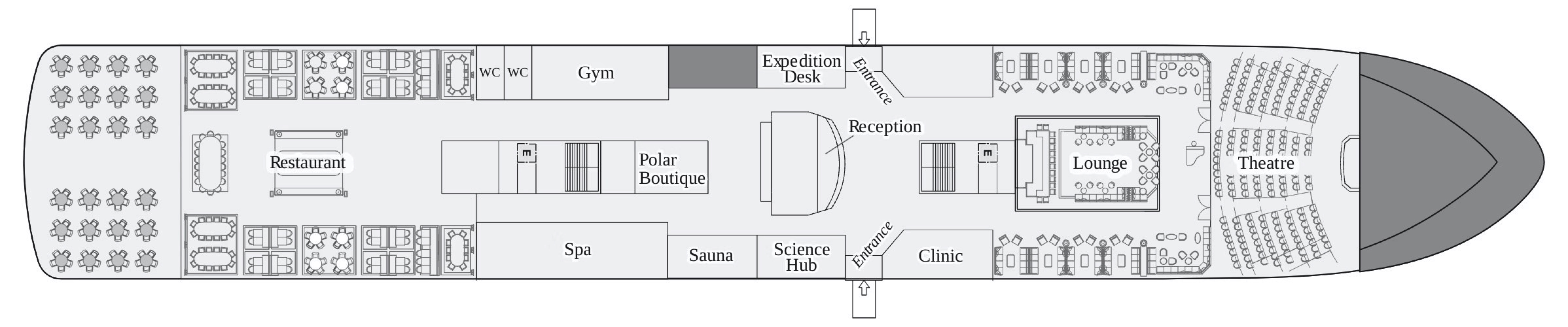 Deck 8 offers a wraparound deck to take in panoramic views of the Polar Regions; various areas also feature heated seating, allowing for optimal comfort while out on deck.