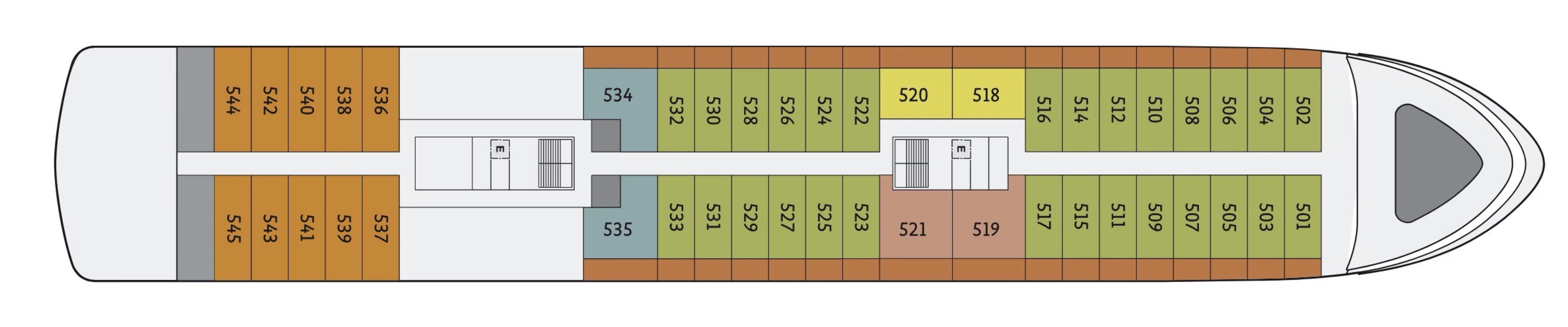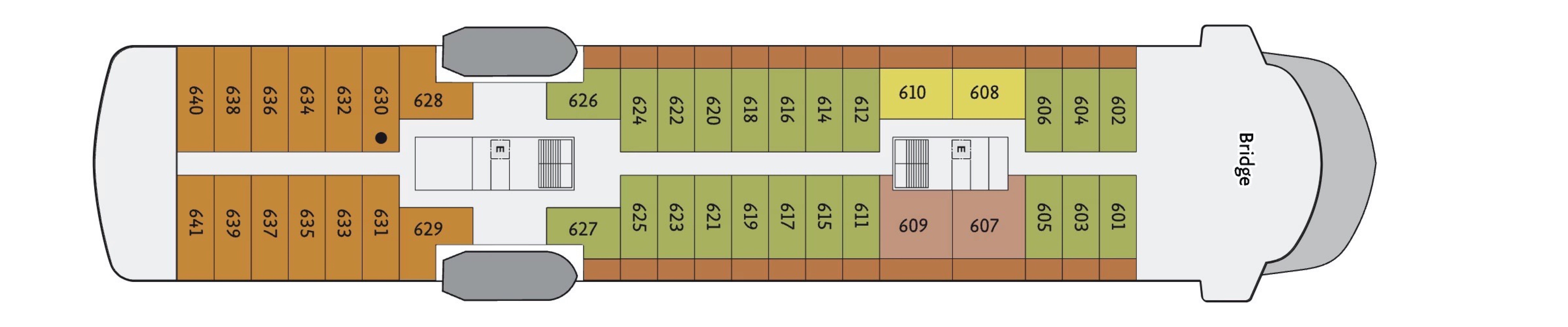 Located on Deck 5, and approximately 345 sq. ft. (32 sq. m) in size, these cabins have one double or two single beds, and a 100 sq. ft. (9.5 sq. m) walk-out balcony with access from sitting room and bedroom. A separate sitting area with sofa, double closets, refrigerator, TV, state of the art “infotainment” system, and private bathroom with shower is also featured in each cabin.
